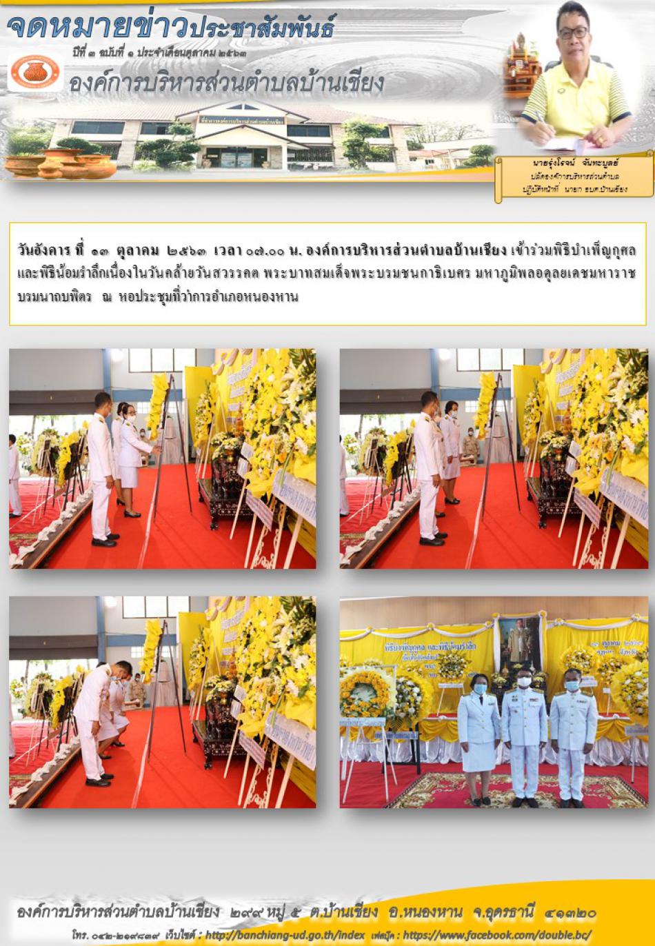 วันอังคาร ที่ ๑๓ ตุลาคม ๒๕๖๓ เวลา ๐๗.๐๐ น. องค์การบริหารส่วนตำบลบ้านเชียง เข้าร่วมพิธีบำเพ็ญกุศลและพิธีน้อมรำลึกเนื่องในวันคล้ายวันสวรรคต พระบาทสมเด็จพระบรมชนกาธิเบศร มหาภูมิพลอดุลยเดชมหาราช บรมนาถบพิตร ณ ...