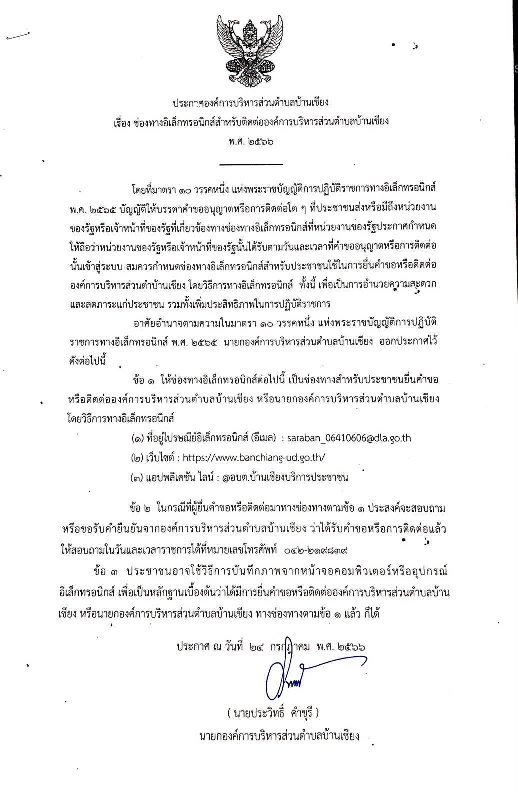 ประกาศ เรื่อง ช่องทางอิเล็กทรอนิกส์สำหรับติดต่อ อบต.บ้านเชียง